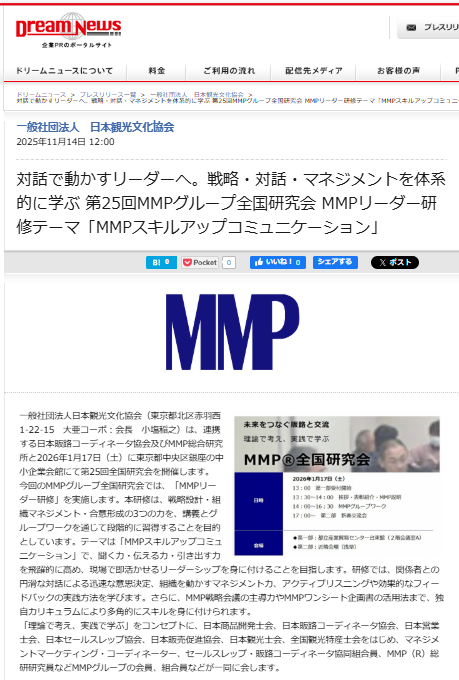 Dream Newsに「対話で動かすリーダーへ。戦略・対話・マネジメントを体系的に学ぶ 第25回MMPグループ全国研究会 MMPリーダー研修テーマ「MMPスキルアップコミュニケーション」が掲載されました。